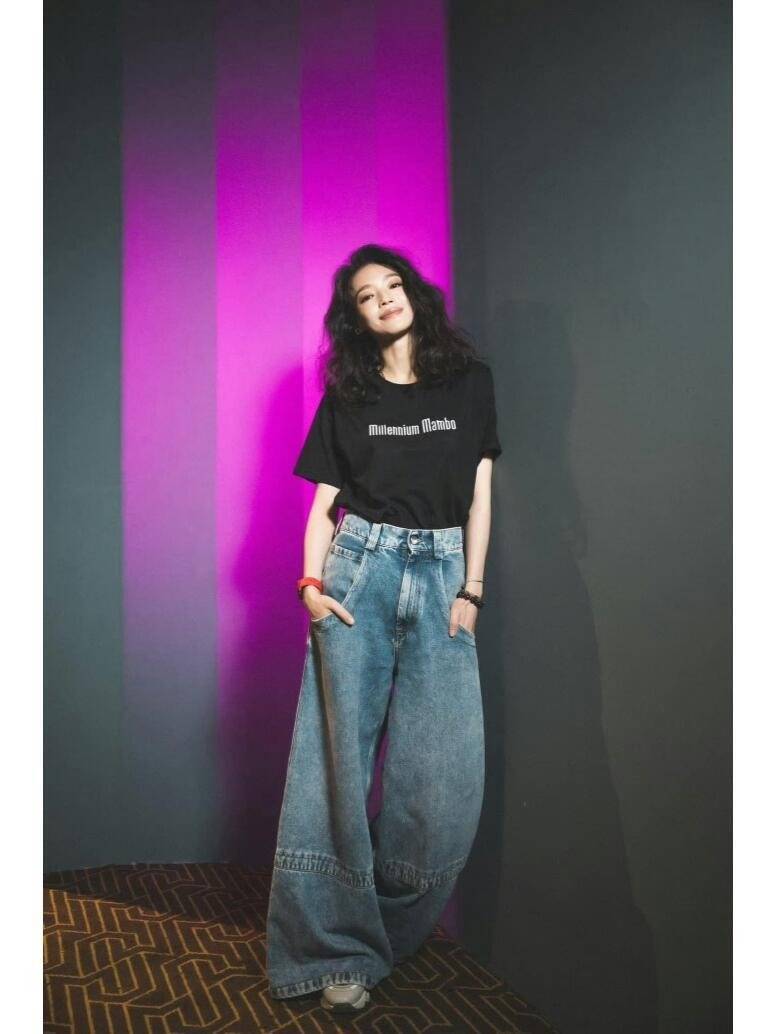 时尚没有标准,适合自己才是最重要的,黑色飘带上衣配水洗牛仔阔腿裤,戴对银色耳环,照样美出圈。