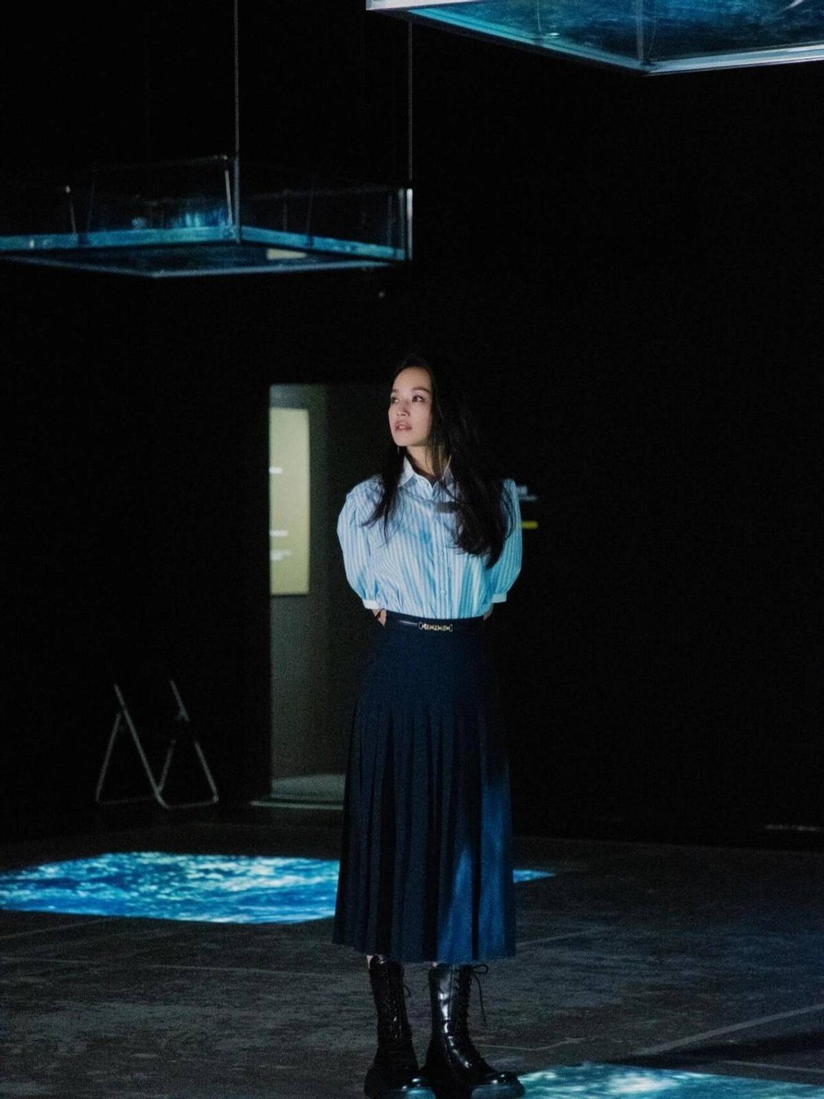 纵向条纹衬衫配黑色百褶裙,利用“蓝+黑”的配色公式,更清晰的分割出了黄金“3:7”比例。