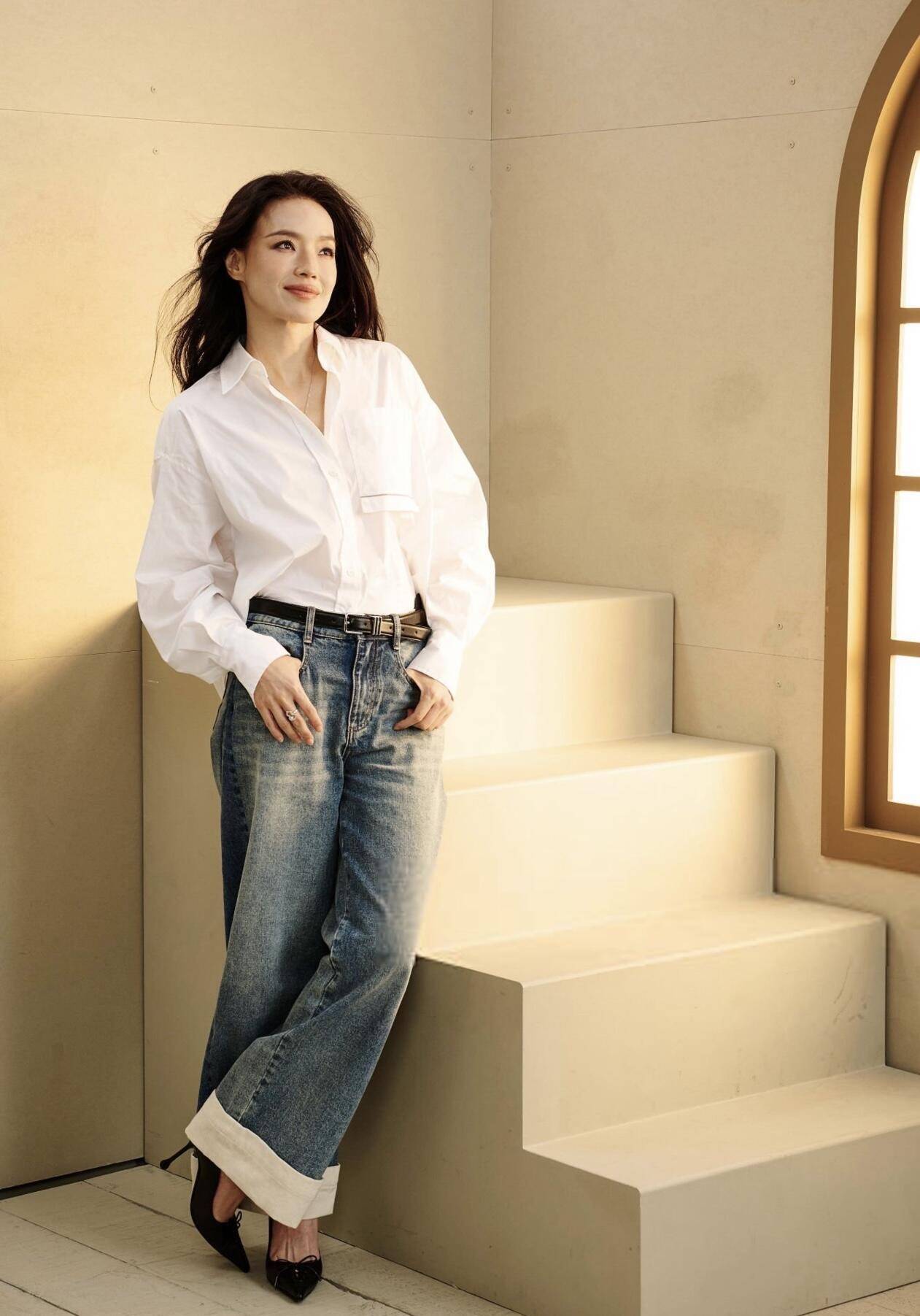白衬衫和牛仔裤的搭配,不挑剔场合,尤其是廓形衬衫,穿在身上特别时髦,裤腿宽一点,造型更洋气。