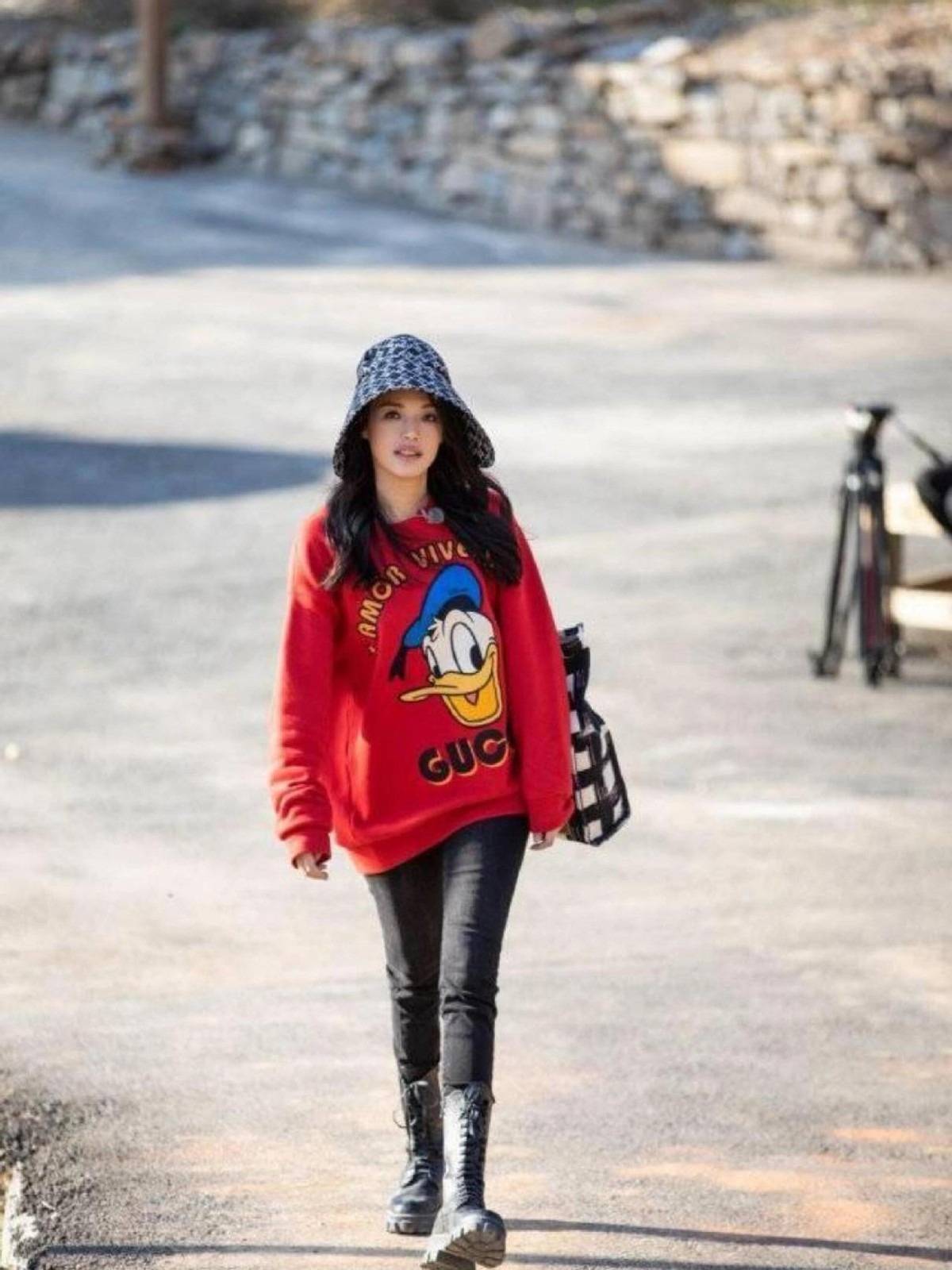红黑配也是非常经典的组合,遮臀长度的红色唐老鸭毛衣,俏皮又有趣,搭配黑色小脚裤,“上宽下窄”,衬托的腿型又细又长。