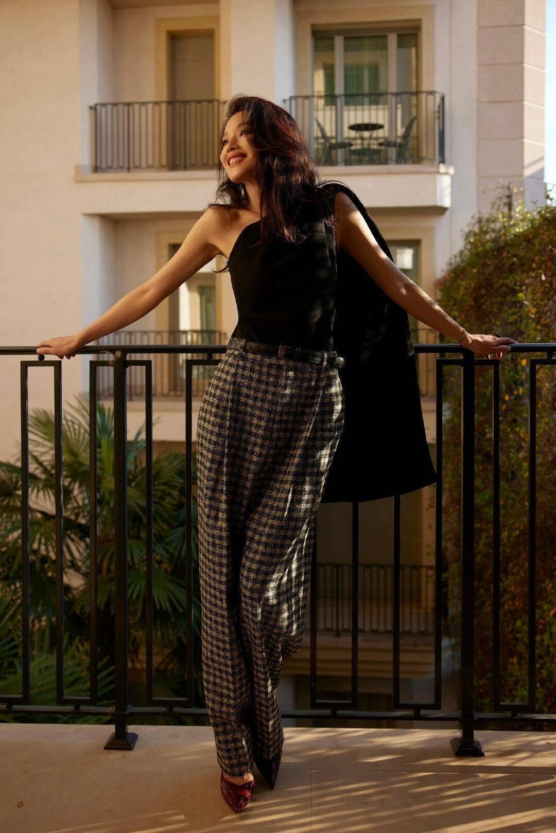 气质高级的女人,穿的越简单越显贵,斜肩设计的黑色上衣,搭配千鸟格西装毛呢裤,随便找一个动作就是大片既视感。