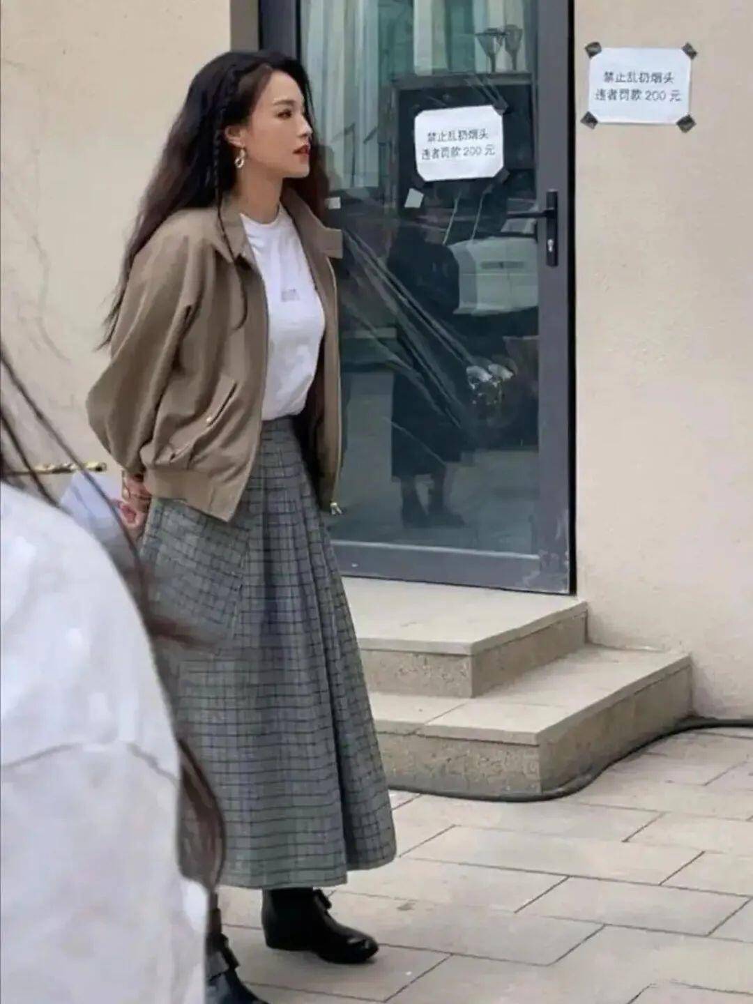 夹克外套在秋天非常实用,直接叠穿在T恤外面,再搭配一条复古感的格纹半裙,秒变“复古摩登女郎”。